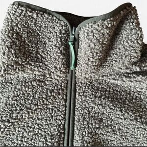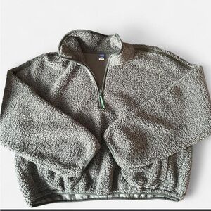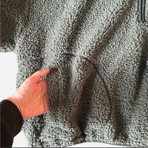 Soft sherpa fleece with a quarter-zip neckline. Relaxed fit with pockets. Dark green. Stock photos show best representation of the color. Size Large.