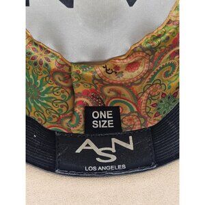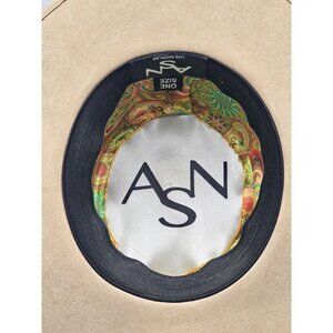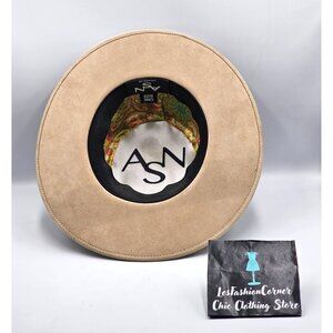 Crafted from soft suede, this stylish tan wide-brim hat features a braided band accent for a refined touch. The interior showcases a colorful paisley lining, adding a pop of personality. Designed by ASN Los Angeles, this hat offers a blend of utility and fashion, suitable for versatile styling.