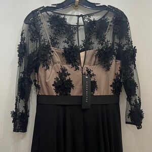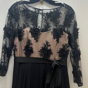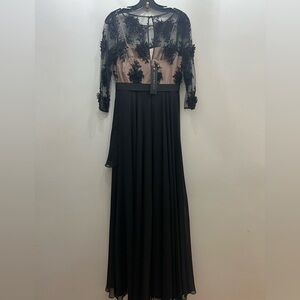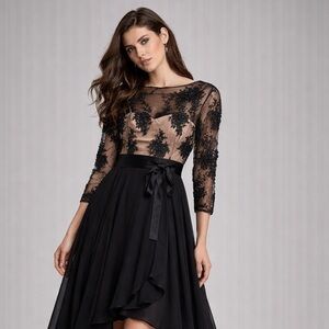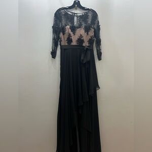 Elegant black evening dress with sheer lace appliqué bodice and flowing high-low chiffon skirt. Satin waist tie defines the silhouette and adds a refined finish. Perfect for formal events and special occasions.