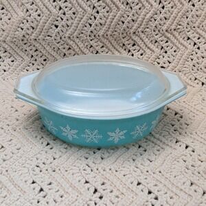 Vintage Pyrex oval casserole dish in the classic Snowflake pattern features a vibrant turquoise blue base with white snowflake graphics. This 1.5-quart baker comes with its original clear glass lid, making it perfect for both oven-to-table serving and storage. Crafted in the USA from durable milk glass, it showcases the mid-century modern aesthetic that collectors love.