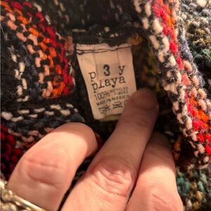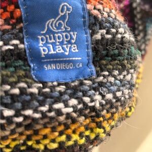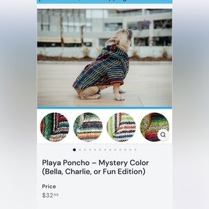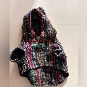 Cozy multicolor knit poncho with hood. Soft, woven fabric provides warm layering for cool days. Stylish striped pattern in black, gray, red, pink, blue, green, yellow, and purple accents. Easy pull-on design for quick dressing. Comfortable and lightweight for everyday wear. FOR DOGS. Worn once by a 9 lb maltipoo.