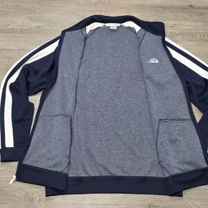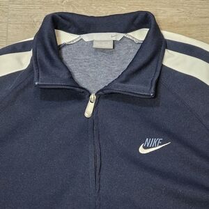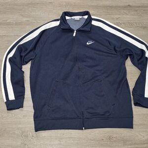 Vintage 90's-Y2K Nike silver tab track jacket. Mens size XXL. This is a full zip up jacket. Blue with white stripes. Large side pockets. Ribbed cuffs & waist. 87% polyester 13% cotton. Armpit to armpit is 25 shoulder to bottom is 30. In great condition no stains or catches.