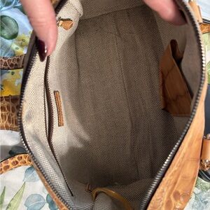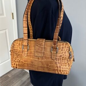 A stunning example of Dooney craftsmanship, this Dooney & Bourke croc-embossed leather barrel satchel in warm honey tan features rich texture, polished silver hardware, and timeless structure. A perfect balance of sophistication and everyday practicality.