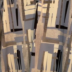 Lightweight Alfani tunic with modern geometric print. Split V-neck with relaxed long sleeves. Flowing, easy-fit silhouette. Stylish neutral and cool tones for versatile wear.