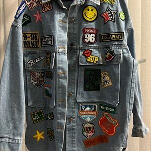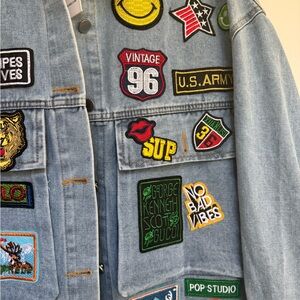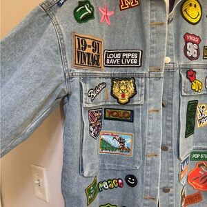 Light blue denim jacket adorned with colorful embroidered patches for a bold, playful look. Features a button-front closure and oversized pockets for casual convenience. Designed to layer over tees for everyday style. Patch detailing adds personality and on-trend flair.
