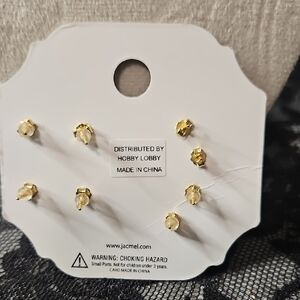 Elegant gold-tone stud earring set featuring cubic zirconia teardrop and leaf designs. Crafted in sterling silver with a polished gold finish. Includes multiple coordinating pairs for versatile styling. The gold color adds a warm, refined touch to any outfit.