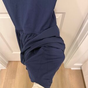Soft navy athletic dress with adjustable thin straps. Built-in shorts underneath with pockets on sides. Lightweight, smooth fabric for everyday wear. Minimal logo detail at the interior. Versatile layer for casual outfits.