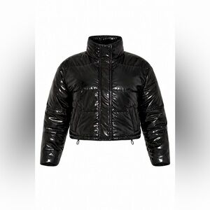 Stylish black glossy puffer jacket with a trendy cropped fit. The shiny patent-style material gives it a modern, statement look while still being warm and comfortable. Features a high stand collar, front zipper closure, and side pockets. Adjustable drawstring at the hem for a better fit.