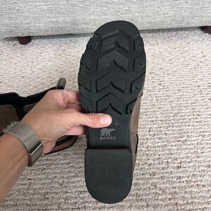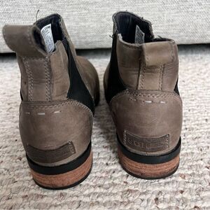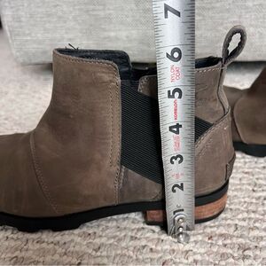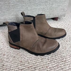In very good preloved condition. Please review all photos before purchase and bundle for a great discount. Your rainy-season go to, this weather-ready ankle boot delivers SOREL's signature style and protection in a wear-all-day design. The women's Emilie Chelsea is crafted of lux, waterproof full-grain leather with a seam-sealed waterproof construction. The sleek, goes-with-anything design includes a sturdy block heel, while stretch panels on the upper get the Emelie on and off with ease.