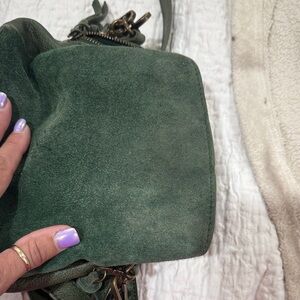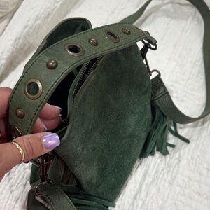 Stylish Free People crossbody in rich olive green. Soft suede texture. Ideal for daily wear.