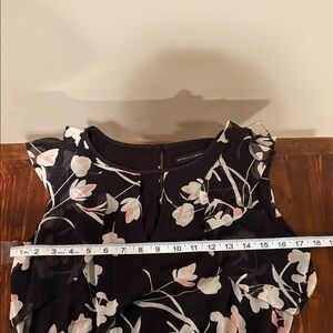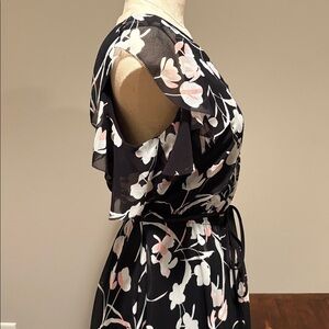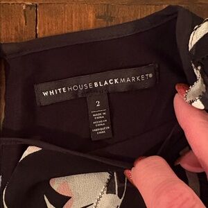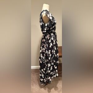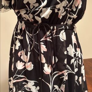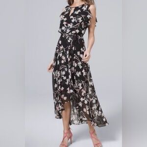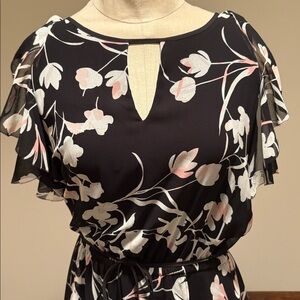 Excellent condition, White House Black Market Flutter Sleeve Floral High Low Dress Size 2. Colors black, gray and pink. Dress is fully lined, elastic waist, tie belt, and one button behind the neck. 100% polyester lining is 97% rayon and 3% spandex - machine wash cold. See pictures for length and armpit to armpit measurements.