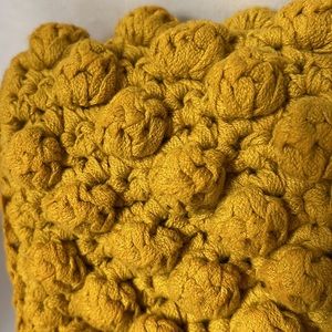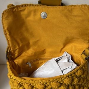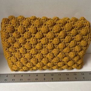 Crochet style purse handbag or clutch in harvest gold yellow popcorn pattern with tortoise shell print buckle