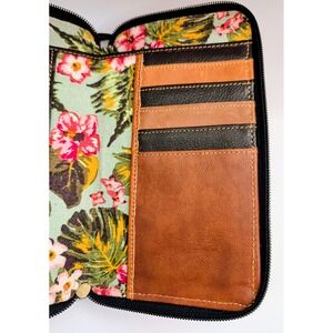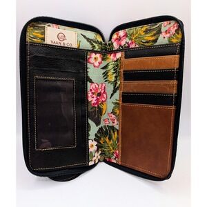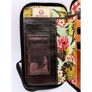 Vaan & Co. upcycled leather and canvas crossbody wallet bag features a vibrant tropical floral print on a sage green background. The exterior is crafted with a patchwork of black leather on the reverse and a bold yellow leather accent on the front flap. This versatile accessory includes an adjustable and removable crossbody strap, allowing it to function as both a shoulder bag and a standalone wallet. The zip-around interior reveals multiple card slots, an ID window, and a full-length bill compartment, all lined with the same tropical floral canvas for a cohesive look. Brass-tone hardware and a decorative wood-bead charm add a touch of bohemian flair to this eco-friendly design.