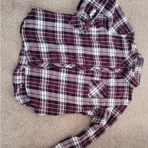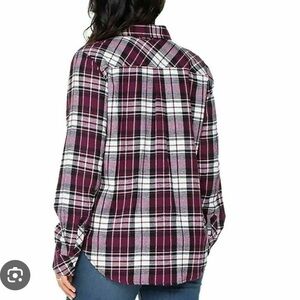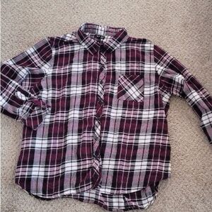 Relaxed-fit plaid button-down with classic collar. Single chest pocket detail. Long sleeves with button cuffs. Easy to style with jeans or skirts.