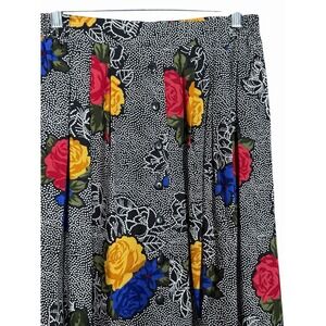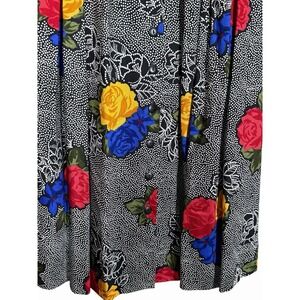 Flowy vintage rayon skirt with bold red, yellow, and royal-blue roses over a black micro-dot background. Lightweight, drapey, and perfect for cottagecore, 90s boho, or everyday romantic styling.