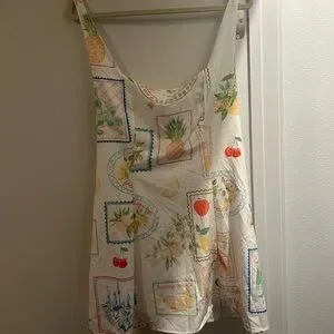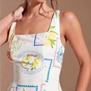 Sleeveless mini dress with square neckline. Features vibrant lemon and botanical stamp prints. Fitted bodice and playful summer vibe. Lightweight and bright for warm days.
