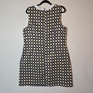 Smak Parlour sleeveless shift dress features a playful black daisy and polka dot print that captures a retro mod aesthetic. Designed with a contrasting white Peter Pan collar and a keyhole neckline accented by oversized white buttons, this piece offers a structured yet comfortable fit thanks to its spandex-blend shell. The back zipper closure ensures easy wear while maintaining a sleek silhouette, making it an ideal choice for vintage-inspired daytime looks or themed events.