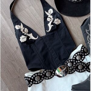 Chic black halter crop top with cream floral embroidery at the bust. Structured fit flatters the waist and adds polished shape. Versatile piece for daytime or night looks. Pair with high-waist jeans or a skirt for instant style.