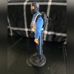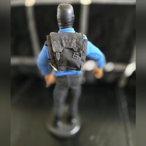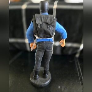 Collectible action figure featuring a striking blue sweater and tactical utility vest. Equipped with detailed accessories including a face mask and utility belt, backpack stand. Perfect for collectors and display.