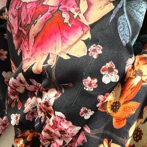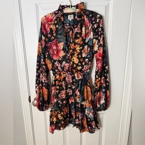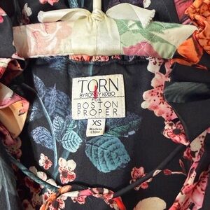 Torn Boston Proper Floral Wrap Mini Dress in Black with Pink & Orange Blooms XS