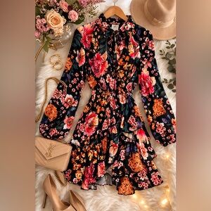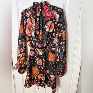 A chic floral wrap mini dress in black with vibrant pink and orange blooms. Features a flattering V-neck, long sleeves, and a tie waist for a tailored fit. Lightweight, flowy fabric creates feminine movement for evening or daytime wear.