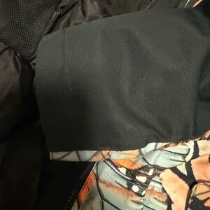 Bold abstract design with blue and orange hues. High collar and secure zip closure. Ideal for skiing and snow adventures. Very gently used and is in new like condition