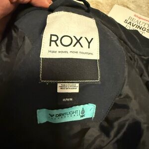 Color is "BHY2". JETTY BLOCK. Fabrics: 10K ROXY DryFlight Technology (10,000mm/5,000g). Insulation: ROXY WarmFlight Eco [Fill weight: 120g body, 100g sleeves, 60g hood]. 100% Polyester Dobby (body, hood, outer sleeve, above chest yoke).