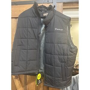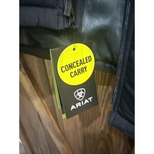 The product is a men's black quilted vest from the brand Ariat, designed in size 3XL. Made from polyester, this regular-sized vest is perfect for men looking to add a stylish and practical piece to their wardrobe. The concealed best design adds a touch of sophistication to the classic black color, making it suitable for various occasions.