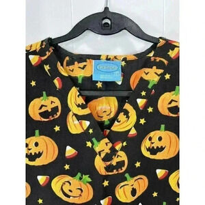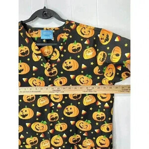 The Scrub Co Sz Large Halloween Scrub Top Pumpkin Jack-o-lantern Candy Corn Star. Garment appears unworn and is still stiff similar to in store. Measurements in photos. Fast shipping!