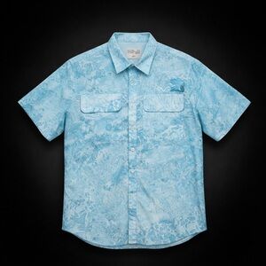 Lightweight performance fishing shirt from Ocean & Coast in collaboration with Realtree. Features a blue water-camo pattern designed for fishing and outdoor activities.