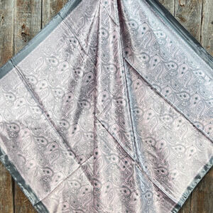 Classic wild rag scarf in pink and gray with a paisley print. Square scarf measures 35" x 35". Adds a bright pop of color to any outfit. 100% machine washable polyester, silky and soft.