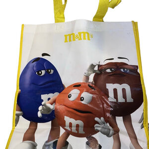 This M&M's World tote bag features a white body with yellow trim and handles, The front displays three M&M's characters: yellow, red, and green. The reverse side shows blue, orange, and brown M&M's characters. Has Tags