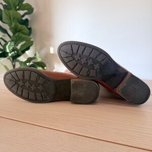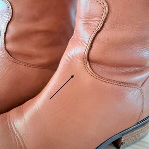 Condition: Gently used/pre-owned in good condition. The leather shows natural creasing and light wear from normal use (see close-up photos of toe/ankle areas and soles). Soles have remaining tread with no major cracking or holes. Zipper works smoothly, no rips/tears, interior lining intact with minor expected wear. Marking at base of one shoe- pointed out in photo.
