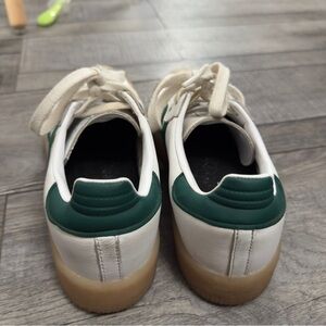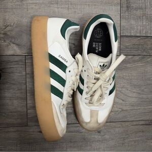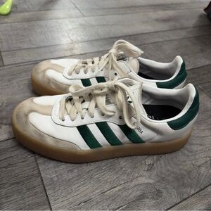 Classic Adidas Samba sneakers. White leather with dark green accents. In perfect condition just needs a little cleaning!!