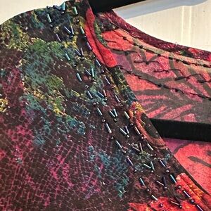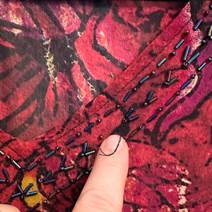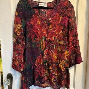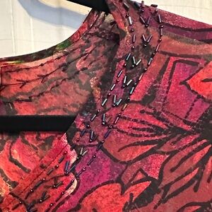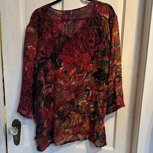 Chico's Vibrant Floral V-Neck sheer Blouse - Red and Black 100% silk