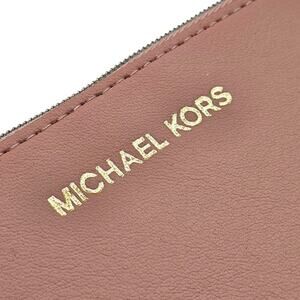 A sleek and compact Michael Kors zip pouch designed for everyday convenience. Crafted from smooth dusty rose polyurethane and finished with elegant gold-tone MICHAEL KORS lettering, this minimalist wallet keeps cards, coins, and small essentials neatly organized while remaining slim enough to fit easily into handbags or pockets.