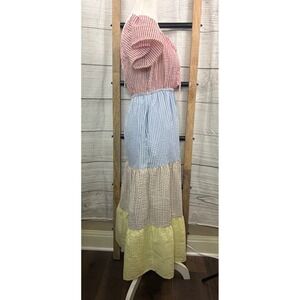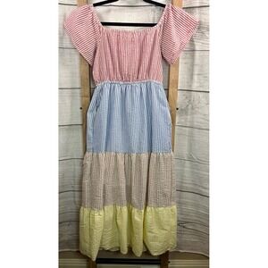 Urban Outfitters tiered midi dress features a charming seersucker texture with multi-color vertical stripes in red, blue, tan, and yellow. Designed with an on or off-the-shoulder stretchy neckline and short sleeves, it includes a comfortable elasticized waist. This breezy, lightweight piece is finished with convenient side pockets and a flowy lined tiered skirt, making it a perfect choice for summer outings or beach days. Cottage core /Prarie vibe.