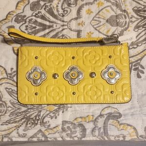 Coach keychain with a lemon charm. Yellow and white enamel details. Silver-tone hardware and ring. Playful and sporty accessory.
