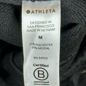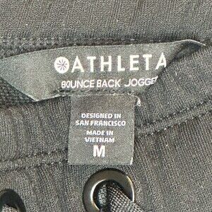 Athleta Bounce Back Jogger pants for women in black, size Medium (regular fit). Polyester/modal stretch fabric with a tapered jogger leg, elastic cuffs, and an elastic waist with drawstring. Two front zip pockets. 27 in inseam. Machine washable. Made in Vietnam. Pre-owned.