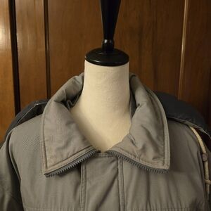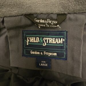 This Vintage Field & Stream Women's Grey Down Fleece Outdoor Jacket in size L is a stylish and functional piece perfect for casual or workwear occasions in the winter or fall. The jacket features a polyester blend outer shell, nylon lining, and insulated with down for added warmth. With a mid-length style, removable hood, inner pockets, and a solid grey color, this coat is a practical and classic addition to any outdoor enthusiast's wardrobe. The Gordon and Ferguson Field and Stream brand ensures quality and durability, making this jacket a timeless choice for outdoor activities.