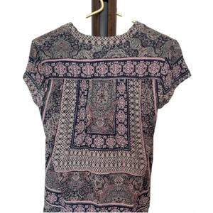 2️⃣ Blue & Pale Pink Cap Sleeve Top – S • Cap sleeves • V‑neck • Rounded & split hem • Cotton/Viscose/Linen blend