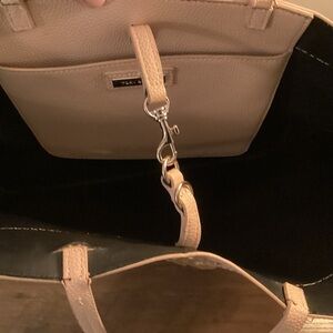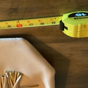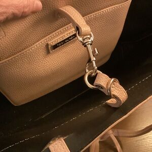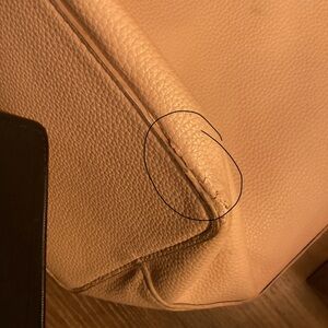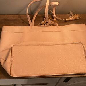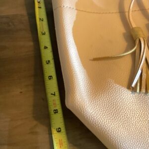 Pebbled leather tote with dual top handles. Gold-tone logo and tassel accents. Open top design with attached tassel charm. Elegant, soft blush color for everyday wear.preowned,has a few imperfections that are barely noticeable, see images they are circled in. Please review all images.