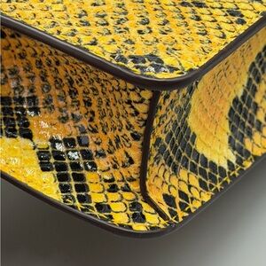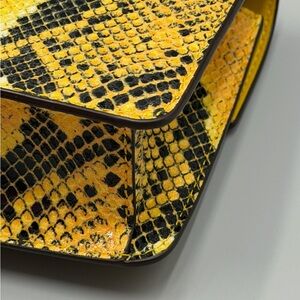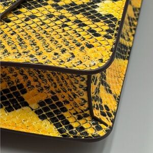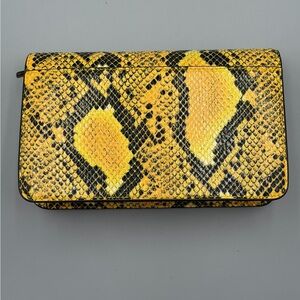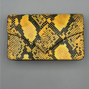 Stylish yellow snake-print envelope clutch for women. Features a bold yellow and black pattern for standout style. Compact and versatile for day-to-night wear. Smooth closure with subtle gold-tone logo accent. Perfect when you want a statement accessory in yellow.