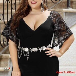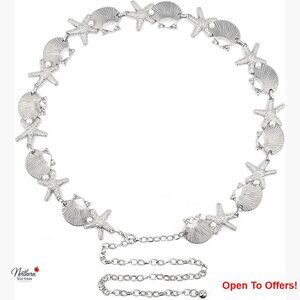 An adjustable waist chain featuring a decorative shell starfish accent with synthetic pearls. This bold accessory is designed to elevate dresses, party outfits, and casual wear for a fashionable statement.