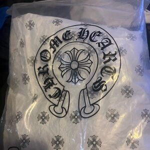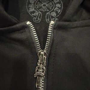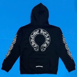 Black zip-up hoodie featuring bold white Chrome Hearts logo graphics. Decorative white sleeve and chest prints. Silver zipper detail. Streetwear staple with branded tags.