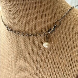 Minimalist silver chain necklace featuring a cream and black triangular pendant. The pendant has clean black stripe accents for a modern, geometric look. Lightweight and versatile for everyday wear. Features a pearl dangle lobster clasp.