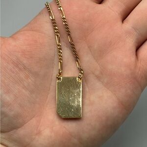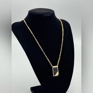 Elegant gold-tone pendant necklace featuring a black inset rectangle. Sleek, modern design that complements both casual and dress looks. Lightweight detailed chain for comfortable all-day wear. The black and gold colors create a polished, versatile statement.