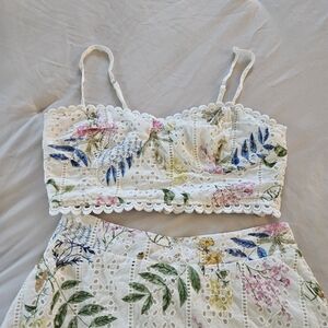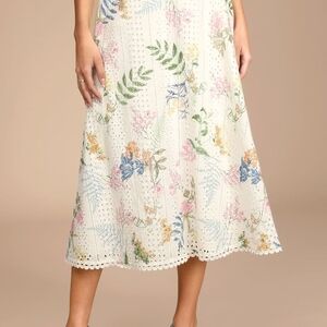 Embrace elegance with this floral cream midi skirt and top. Perfect for any occasion.