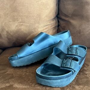 Platform sandals with two adjustable buckles. Cushioned contoured footbed for comfort. Thick platform sole adds height. Minimal, versatile design.