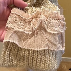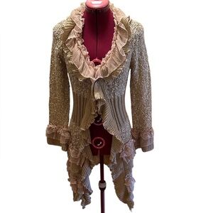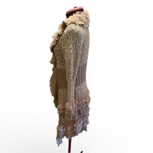 Gorgeous Beige Ruffled Knit Cardigan Sweater Mid-Thigh Boho Fringe Open Front